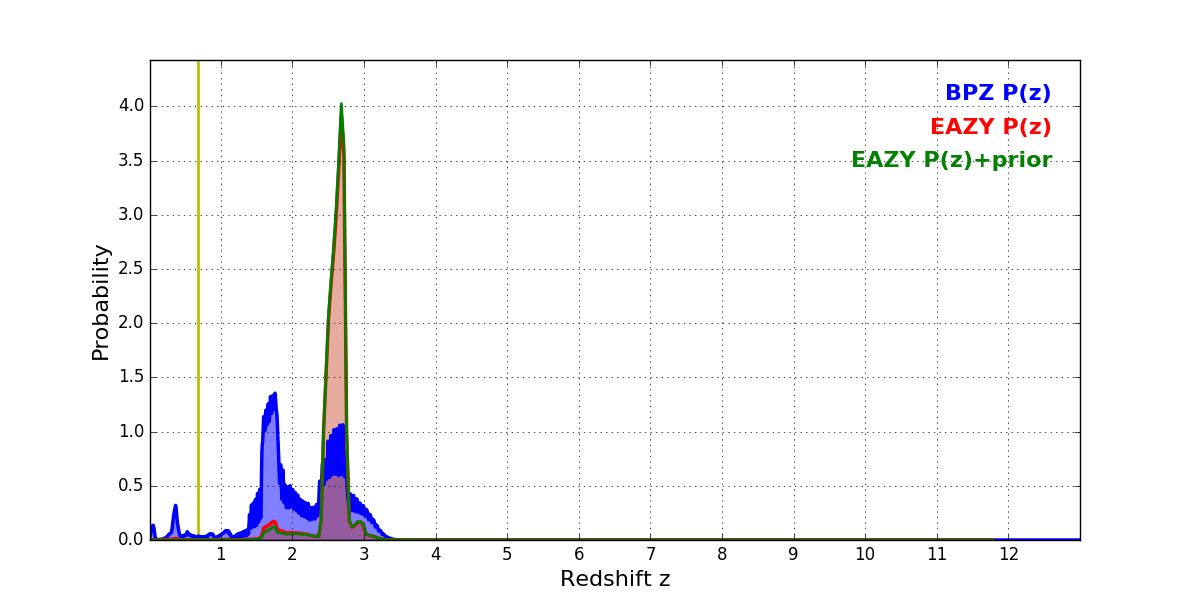 In P(z) plots: Yellow lines mark the cluster redshift z = 0.677,