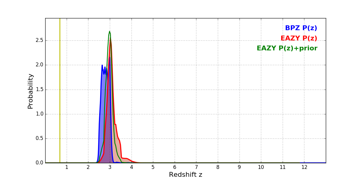 In P(z) plots: Yellow lines mark the cluster redshift z = 0.677,