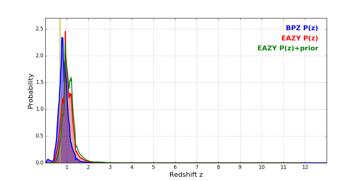 In P(z) plots: Yellow lines mark the cluster redshift z = 0.677,