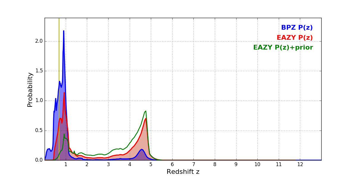 In P(z) plots: Yellow lines mark the cluster redshift z = 0.677,