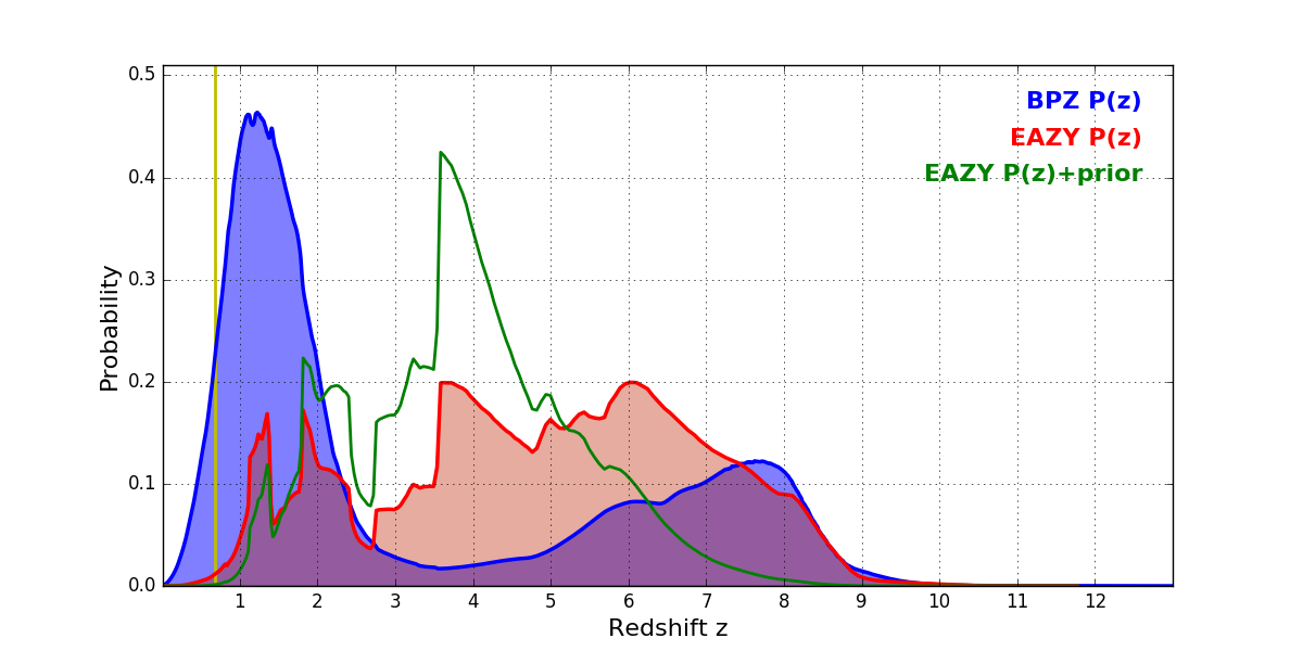 In P(z) plots: Yellow lines mark the cluster redshift z = 0.677,