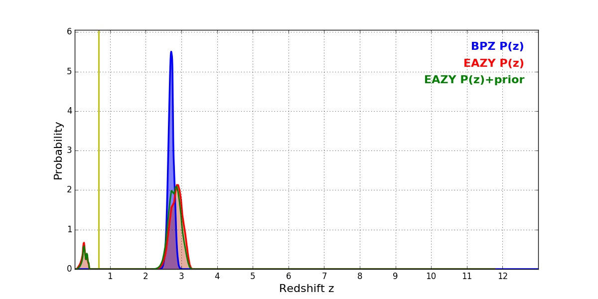 In P(z) plots: Yellow lines mark the cluster redshift z = 0.677,