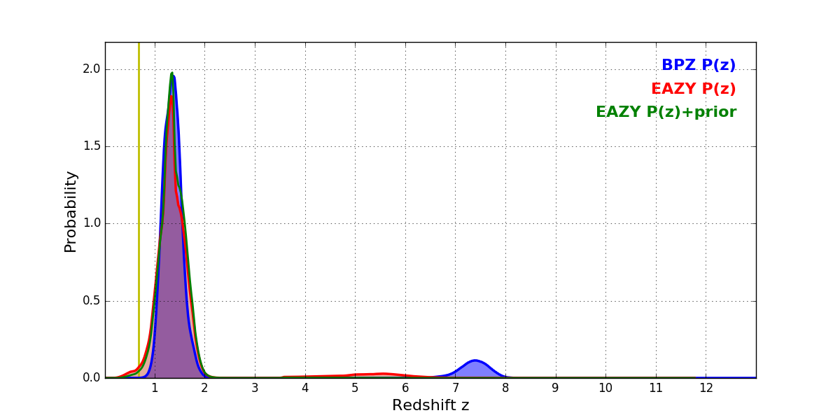 In P(z) plots: Yellow lines mark the cluster redshift z = 0.677,