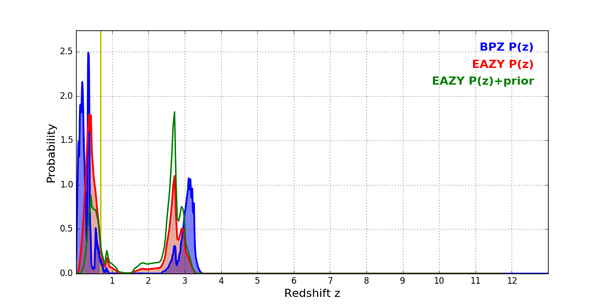 In P(z) plots: Yellow lines mark the cluster redshift z = 0.677,