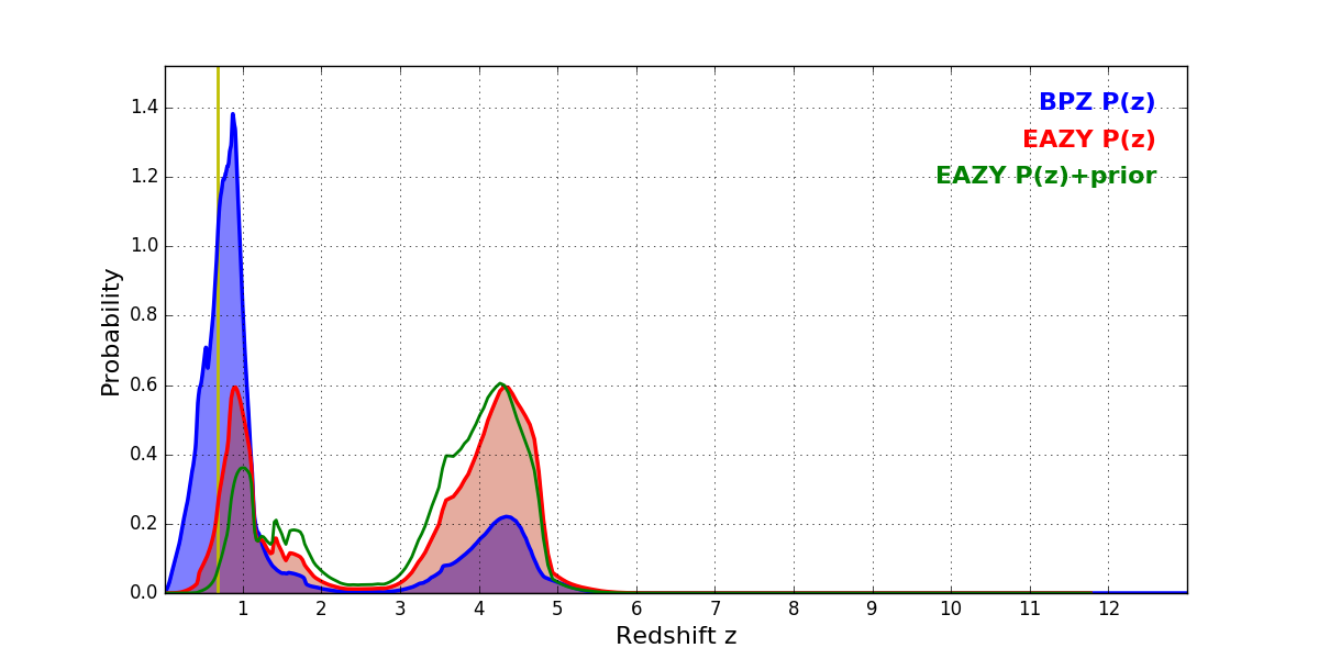 In P(z) plots: Yellow lines mark the cluster redshift z = 0.677,