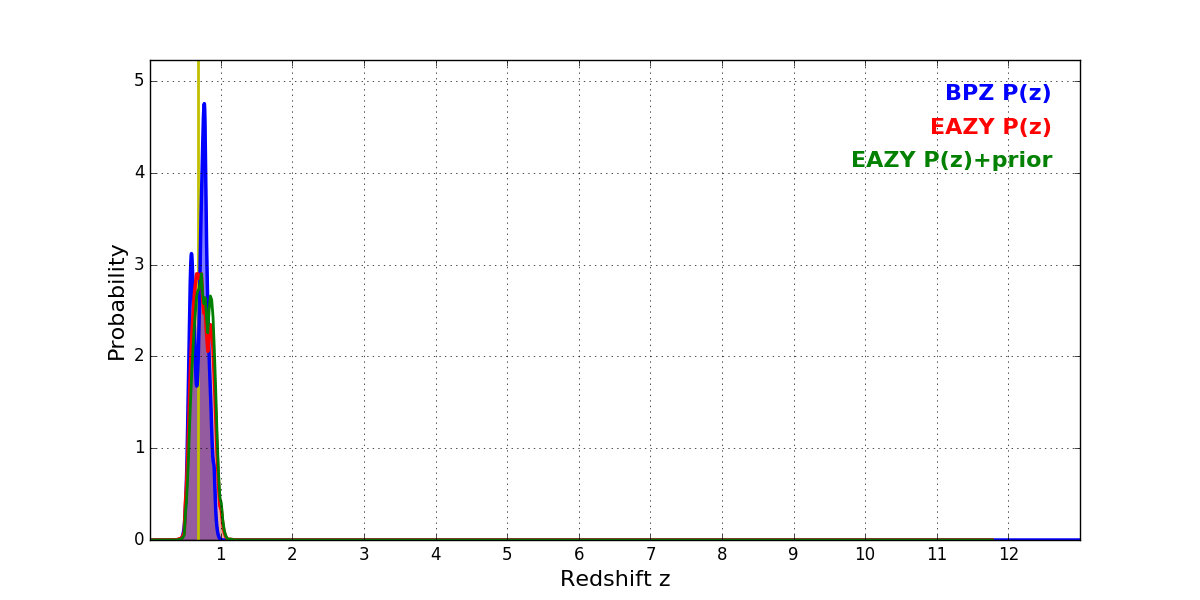 In P(z) plots: Yellow lines mark the cluster redshift z = 0.677,