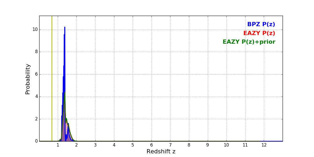 In P(z) plots: Yellow lines mark the cluster redshift z = 0.677,