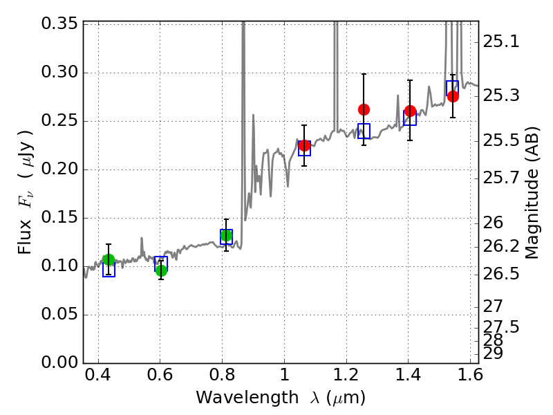 Object #1005   x,y = (2756, 3577)   RA, Dec = (07:22:22.176, 07:25:36.48) = (110.59240, 7.42680)   BPZ = 1.333 [1.053--1.716]   type = 9.30 (SB2_B10 - SB3_B10)   stellarity = 0.00   chisq2 = 0.18   ODDS = 0.41   z_cluster = 0.677