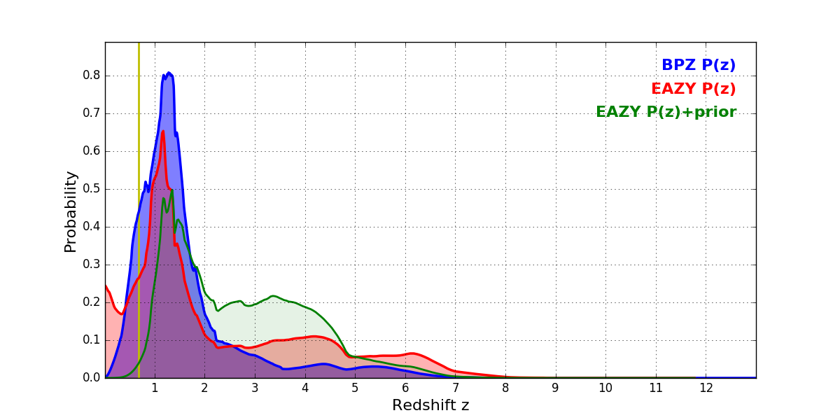 In P(z) plots: Yellow lines mark the cluster redshift z = 0.677,
