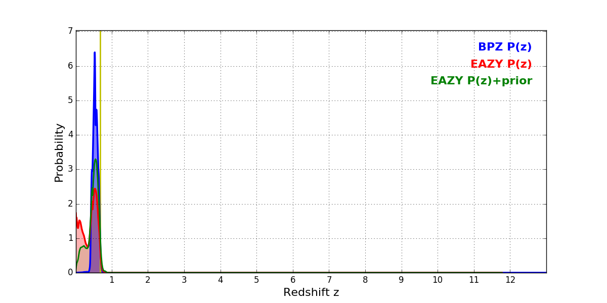 In P(z) plots: Yellow lines mark the cluster redshift z = 0.677,