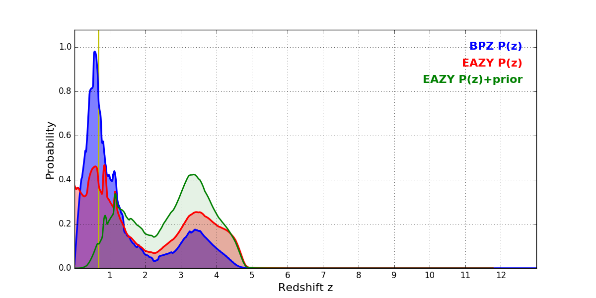 In P(z) plots: Yellow lines mark the cluster redshift z = 0.677,