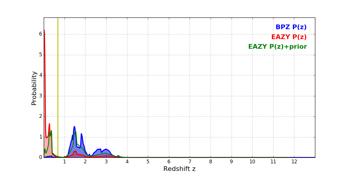 In P(z) plots: Yellow lines mark the cluster redshift z = 0.677,