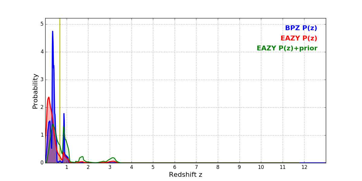 In P(z) plots: Yellow lines mark the cluster redshift z = 0.677,