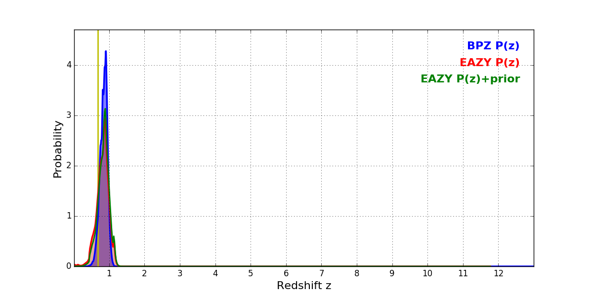 In P(z) plots: Yellow lines mark the cluster redshift z = 0.677,