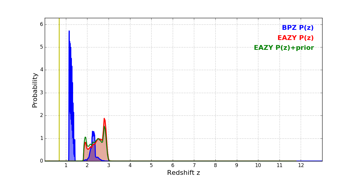 In P(z) plots: Yellow lines mark the cluster redshift z = 0.677,