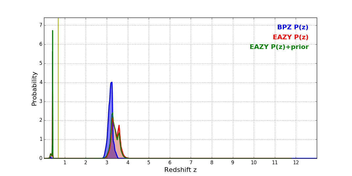 In P(z) plots: Yellow lines mark the cluster redshift z = 0.677,