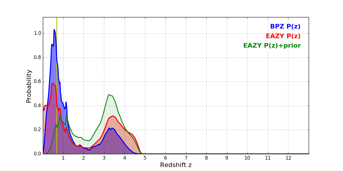 In P(z) plots: Yellow lines mark the cluster redshift z = 0.677,