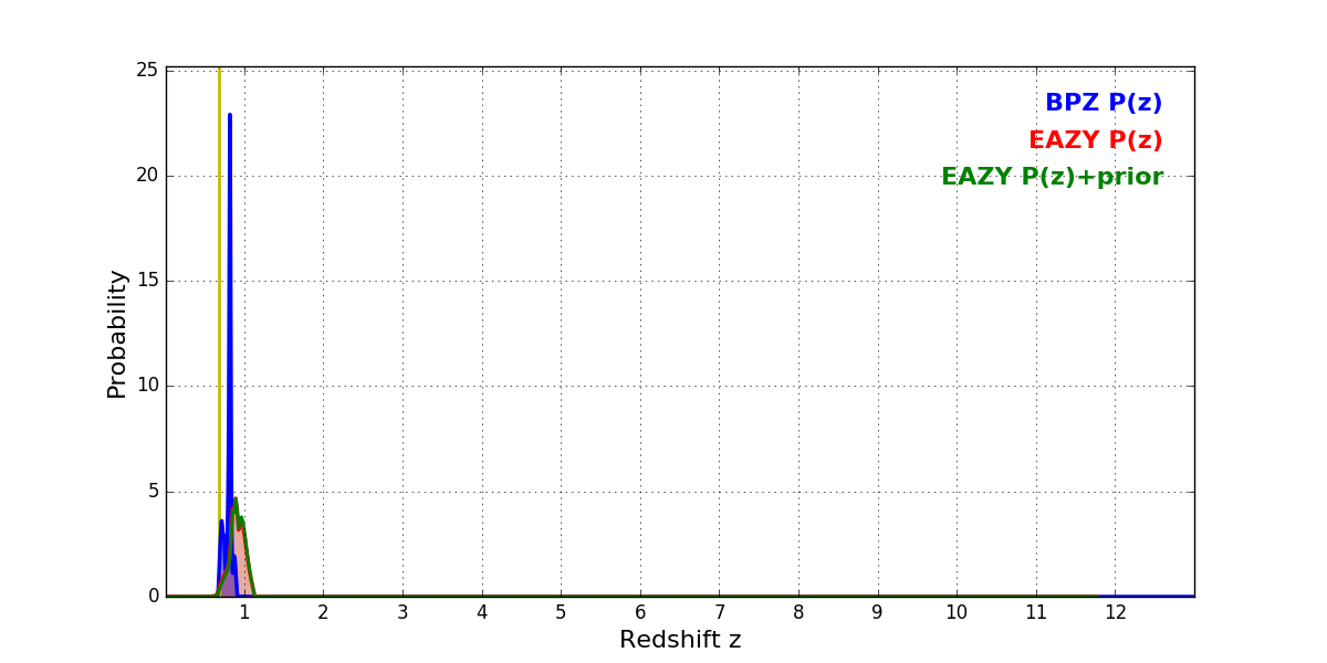 In P(z) plots: Yellow lines mark the cluster redshift z = 0.677,