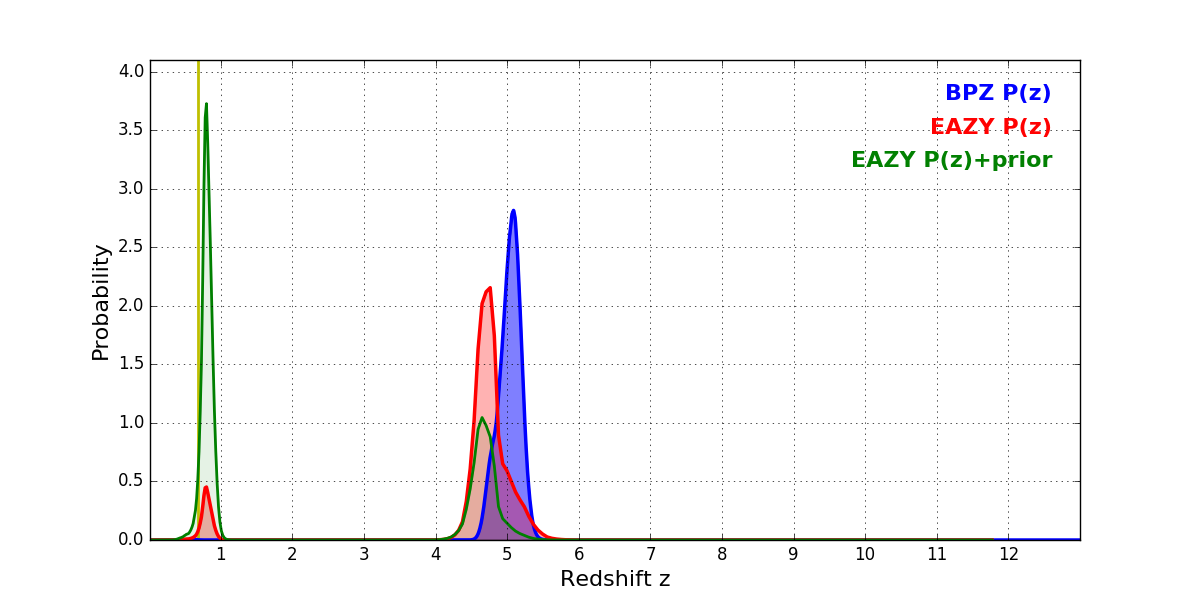 In P(z) plots: Yellow lines mark the cluster redshift z = 0.677,