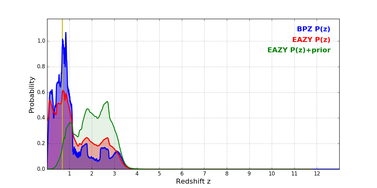 In P(z) plots: Yellow lines mark the cluster redshift z = 0.677,