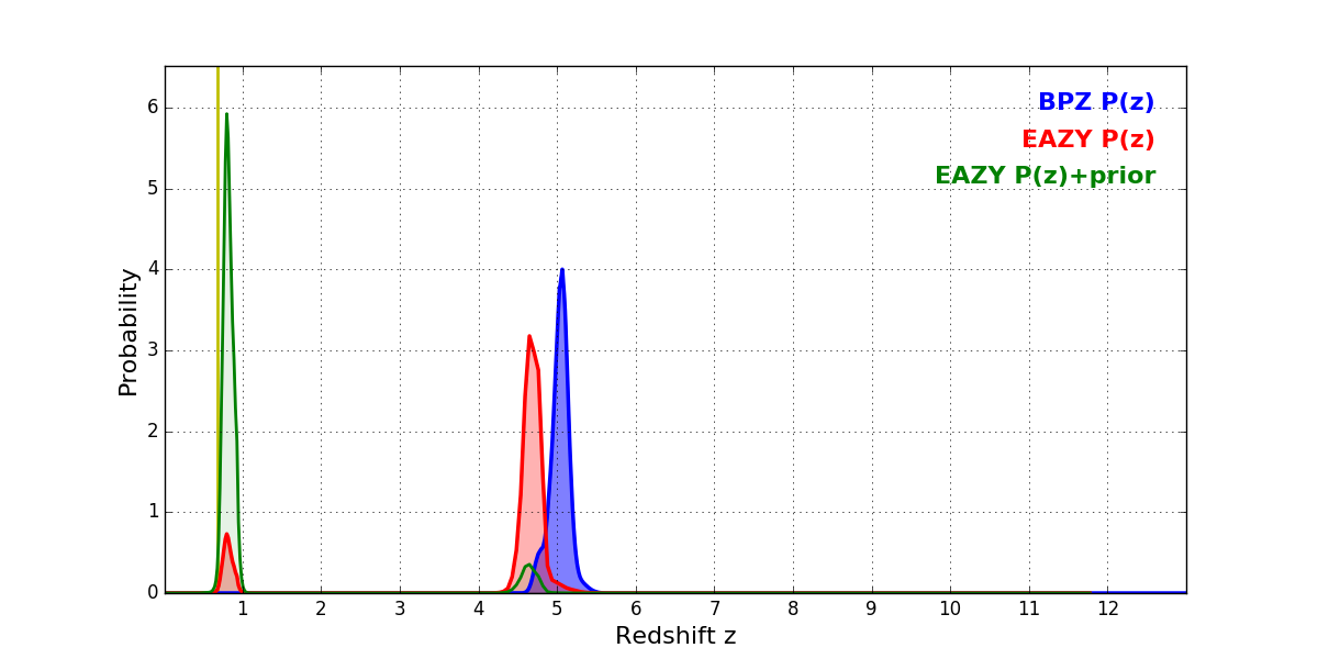 In P(z) plots: Yellow lines mark the cluster redshift z = 0.677,