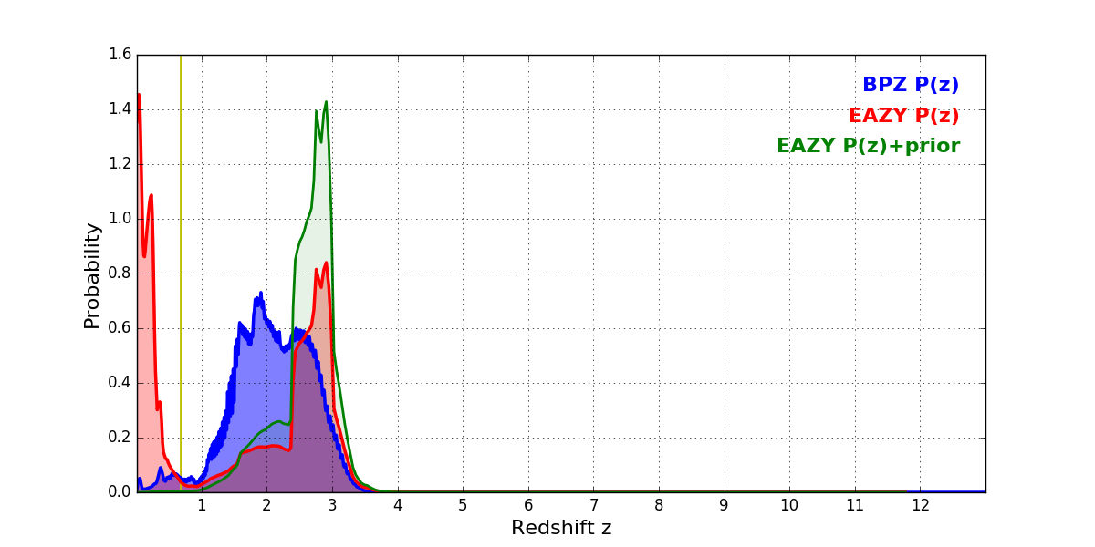 In P(z) plots: Yellow lines mark the cluster redshift z = 0.677,