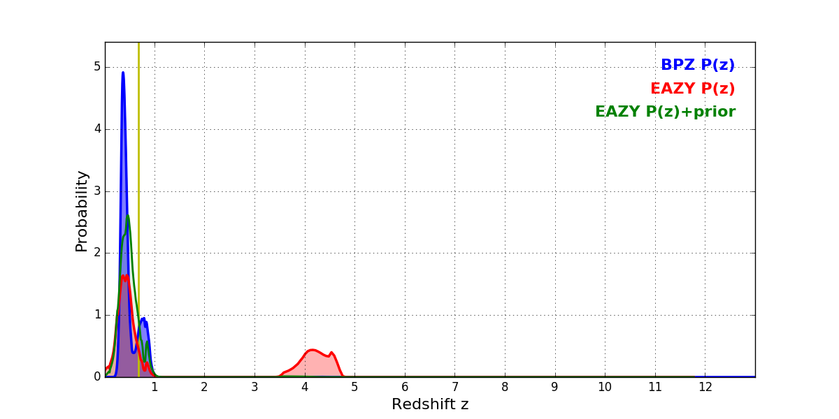 In P(z) plots: Yellow lines mark the cluster redshift z = 0.677,