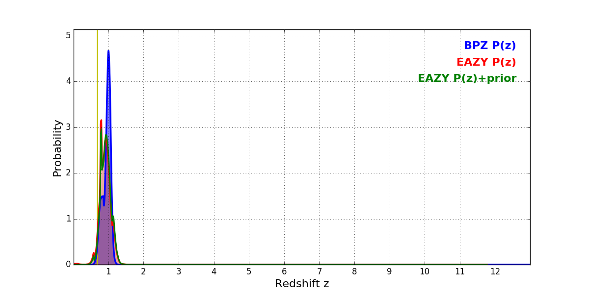 In P(z) plots: Yellow lines mark the cluster redshift z = 0.677,