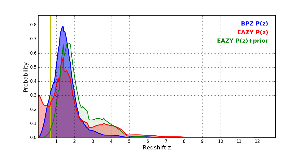 In P(z) plots: Yellow lines mark the cluster redshift z = 0.677,