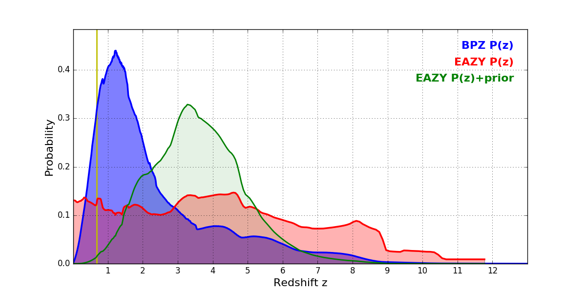 In P(z) plots: Yellow lines mark the cluster redshift z = 0.677,