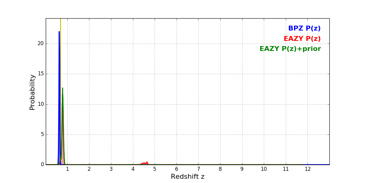 In P(z) plots: Yellow lines mark the cluster redshift z = 0.677,