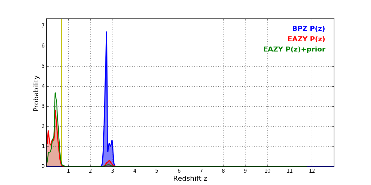 In P(z) plots: Yellow lines mark the cluster redshift z = 0.677,