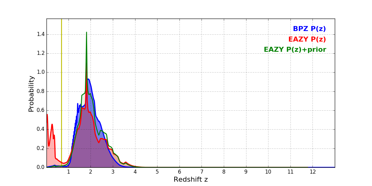 In P(z) plots: Yellow lines mark the cluster redshift z = 0.677,
