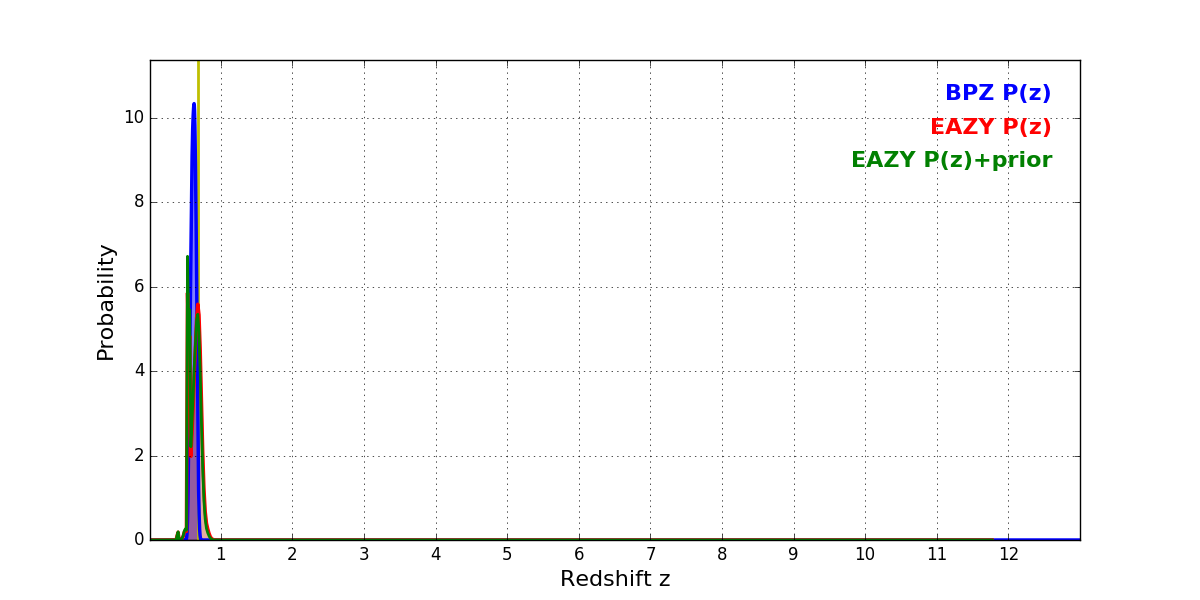 In P(z) plots: Yellow lines mark the cluster redshift z = 0.677,