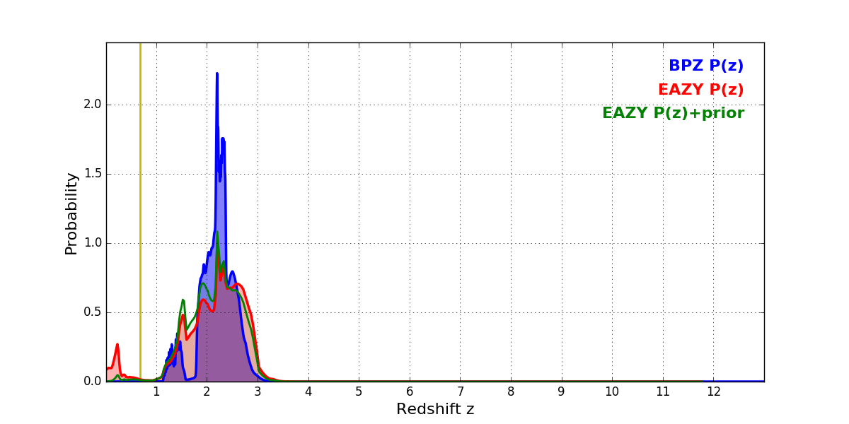 In P(z) plots: Yellow lines mark the cluster redshift z = 0.677,