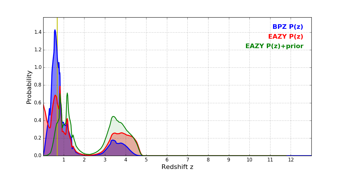 In P(z) plots: Yellow lines mark the cluster redshift z = 0.677,