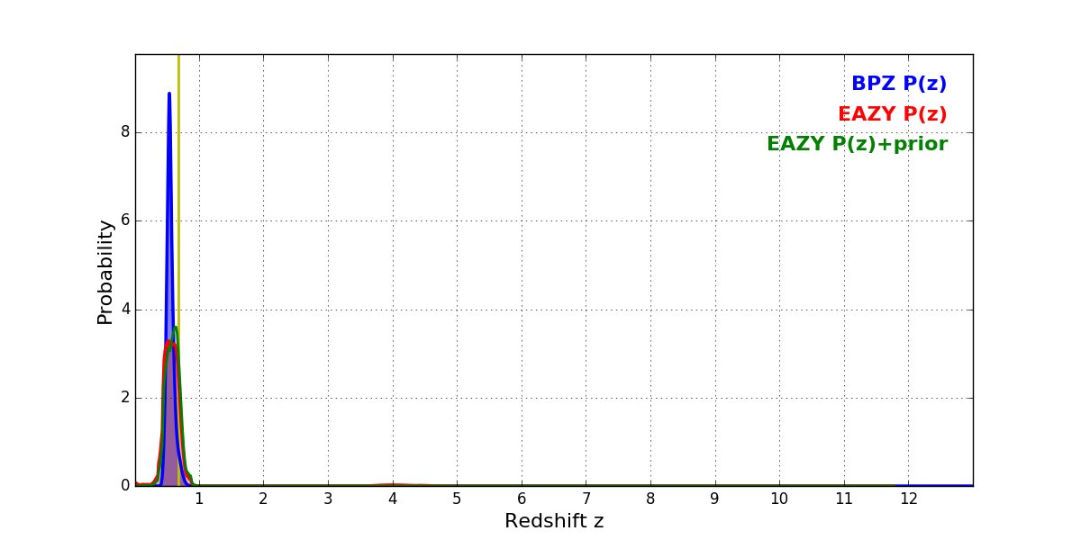 In P(z) plots: Yellow lines mark the cluster redshift z = 0.677,