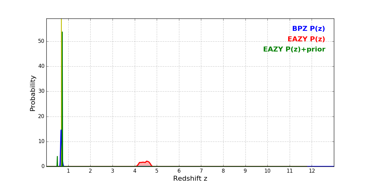 In P(z) plots: Yellow lines mark the cluster redshift z = 0.677,
