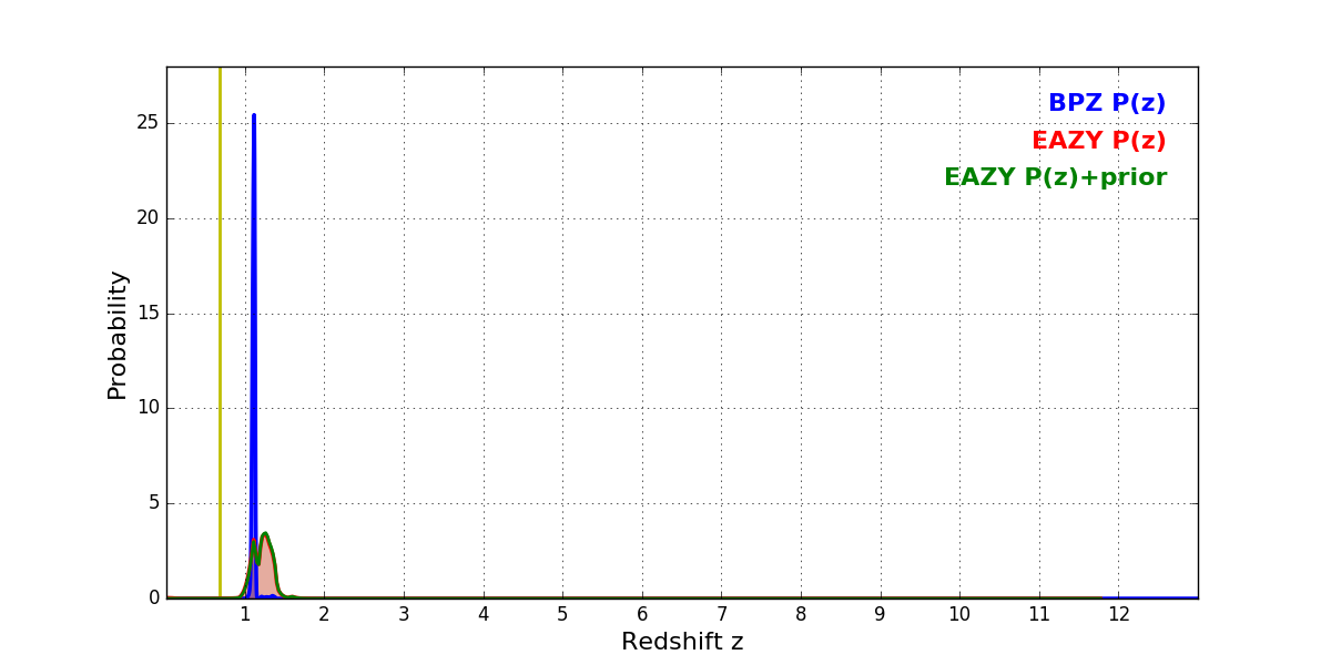 In P(z) plots: Yellow lines mark the cluster redshift z = 0.677,