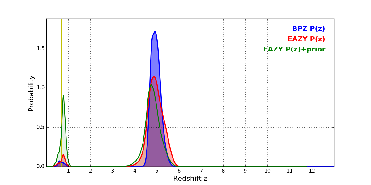 In P(z) plots: Yellow lines mark the cluster redshift z = 0.677,