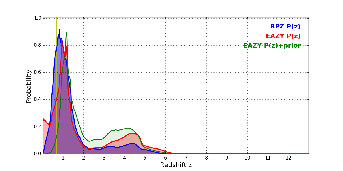 In P(z) plots: Yellow lines mark the cluster redshift z = 0.677,