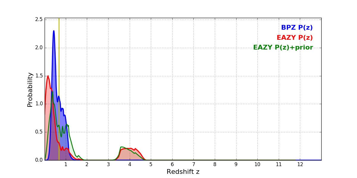 In P(z) plots: Yellow lines mark the cluster redshift z = 0.677,