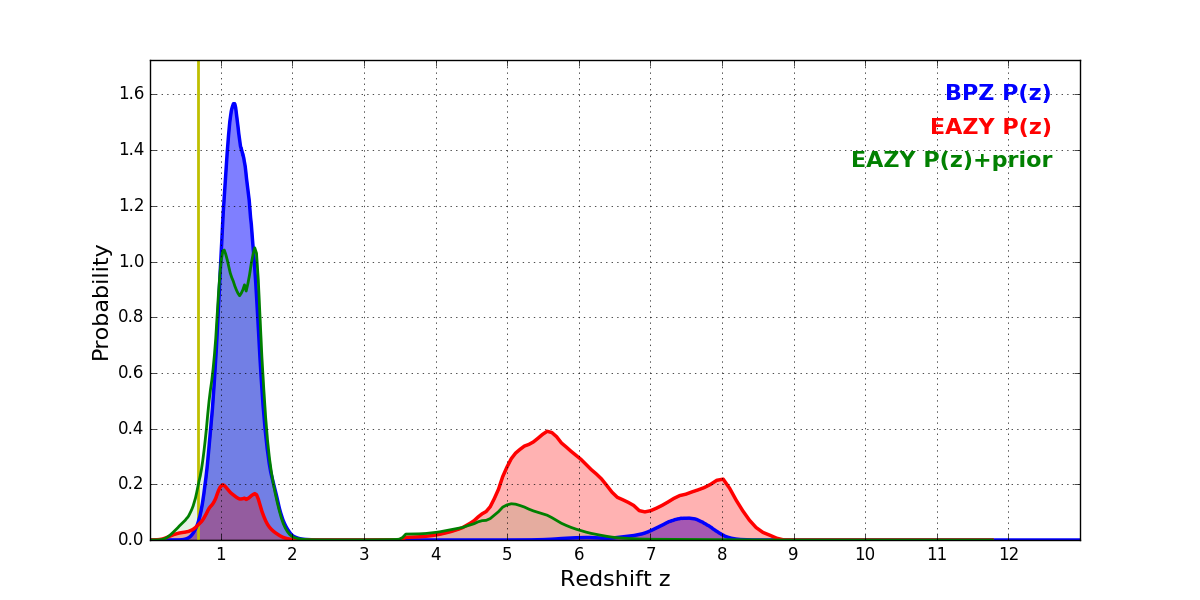 In P(z) plots: Yellow lines mark the cluster redshift z = 0.677,