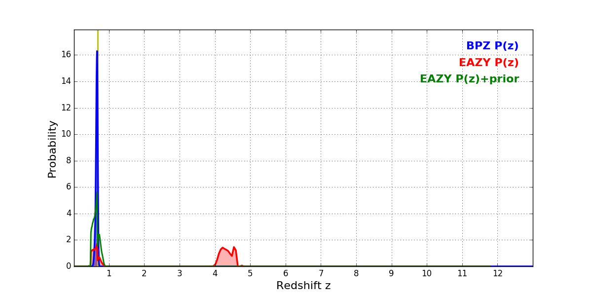 In P(z) plots: Yellow lines mark the cluster redshift z = 0.677,