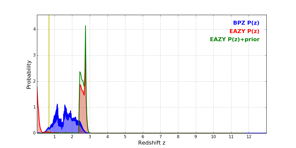 In P(z) plots: Yellow lines mark the cluster redshift z = 0.677,