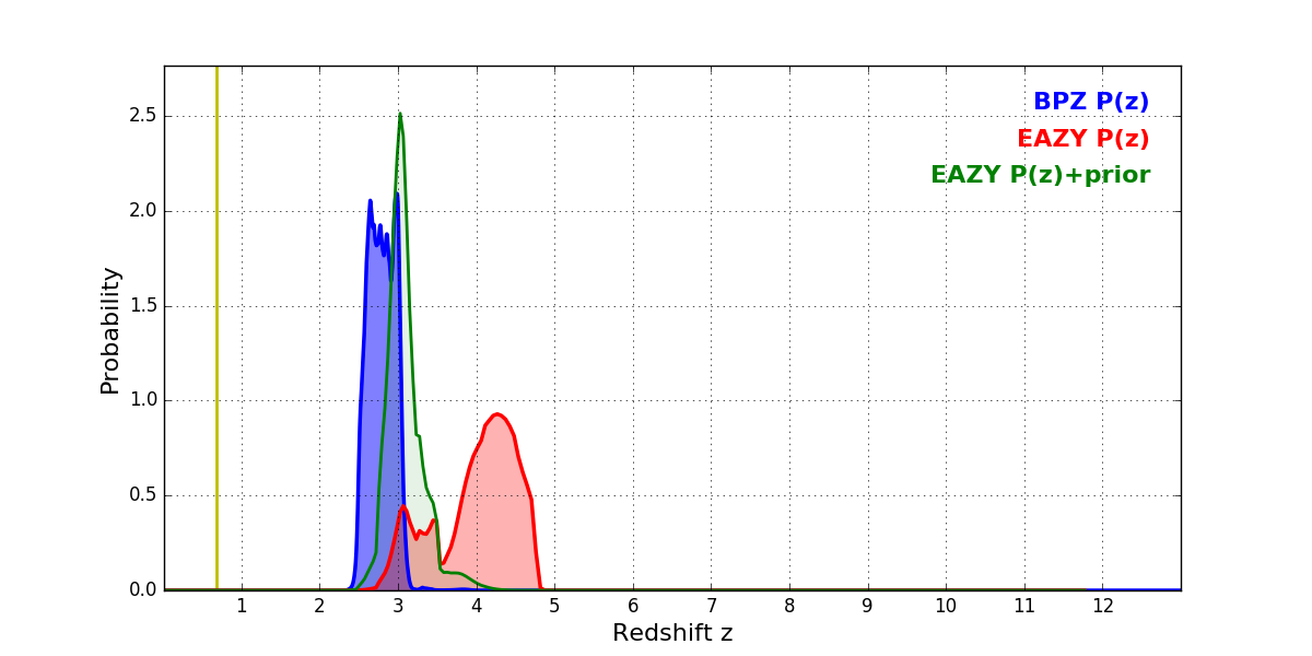 In P(z) plots: Yellow lines mark the cluster redshift z = 0.677,