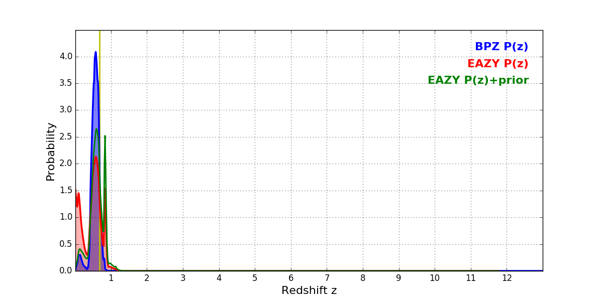 In P(z) plots: Yellow lines mark the cluster redshift z = 0.677,