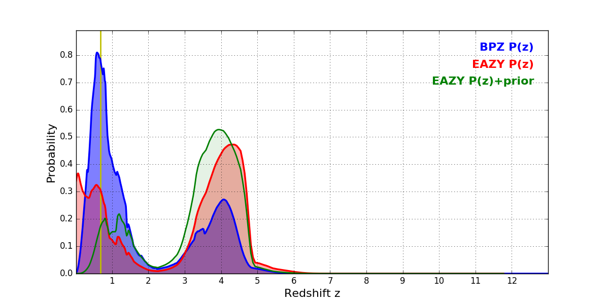 In P(z) plots: Yellow lines mark the cluster redshift z = 0.677,