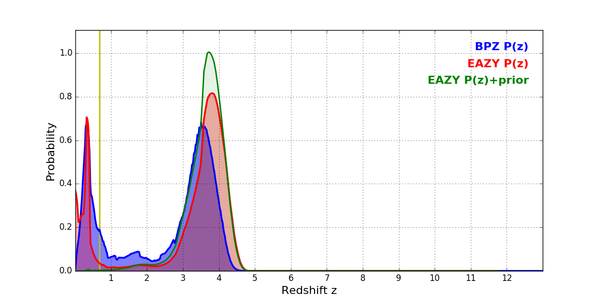 In P(z) plots: Yellow lines mark the cluster redshift z = 0.677,