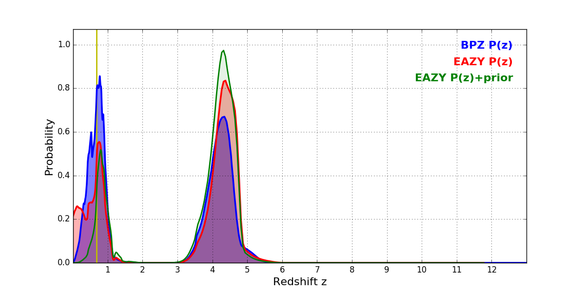 In P(z) plots: Yellow lines mark the cluster redshift z = 0.677,
